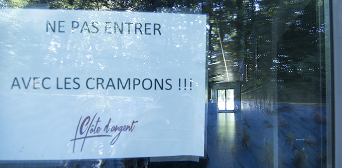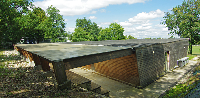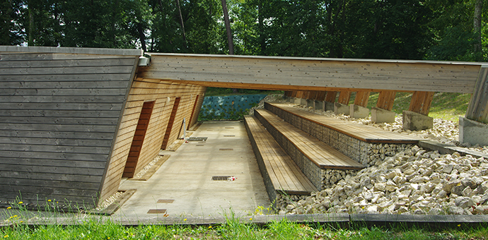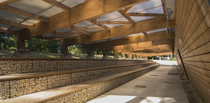 Par l'ancrage : à l'arrière du complexe sportif, le système de gradins en gabions associé à la charpente en lamellé-collé inclinée, posées sur blocs béton, assurent la transition. Cet espace couvert protège l'accès aux vestiaires pour les joueurs et arbitres, une fois qu'ils ont longé par un chemin l'édifice compact.