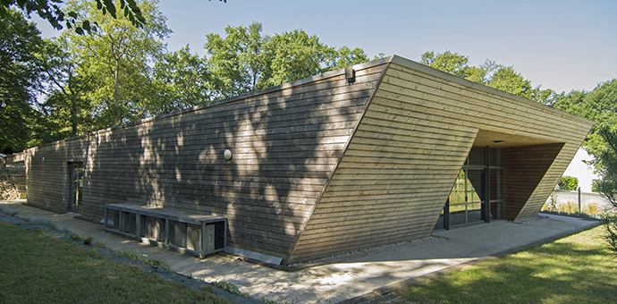 Comment positionner un bâtiment entre deux univers ? Entre une parcelle boisée légèrement en pente et de plats terrains de sport enherbés ? Entre l'ombre et la lumière ?